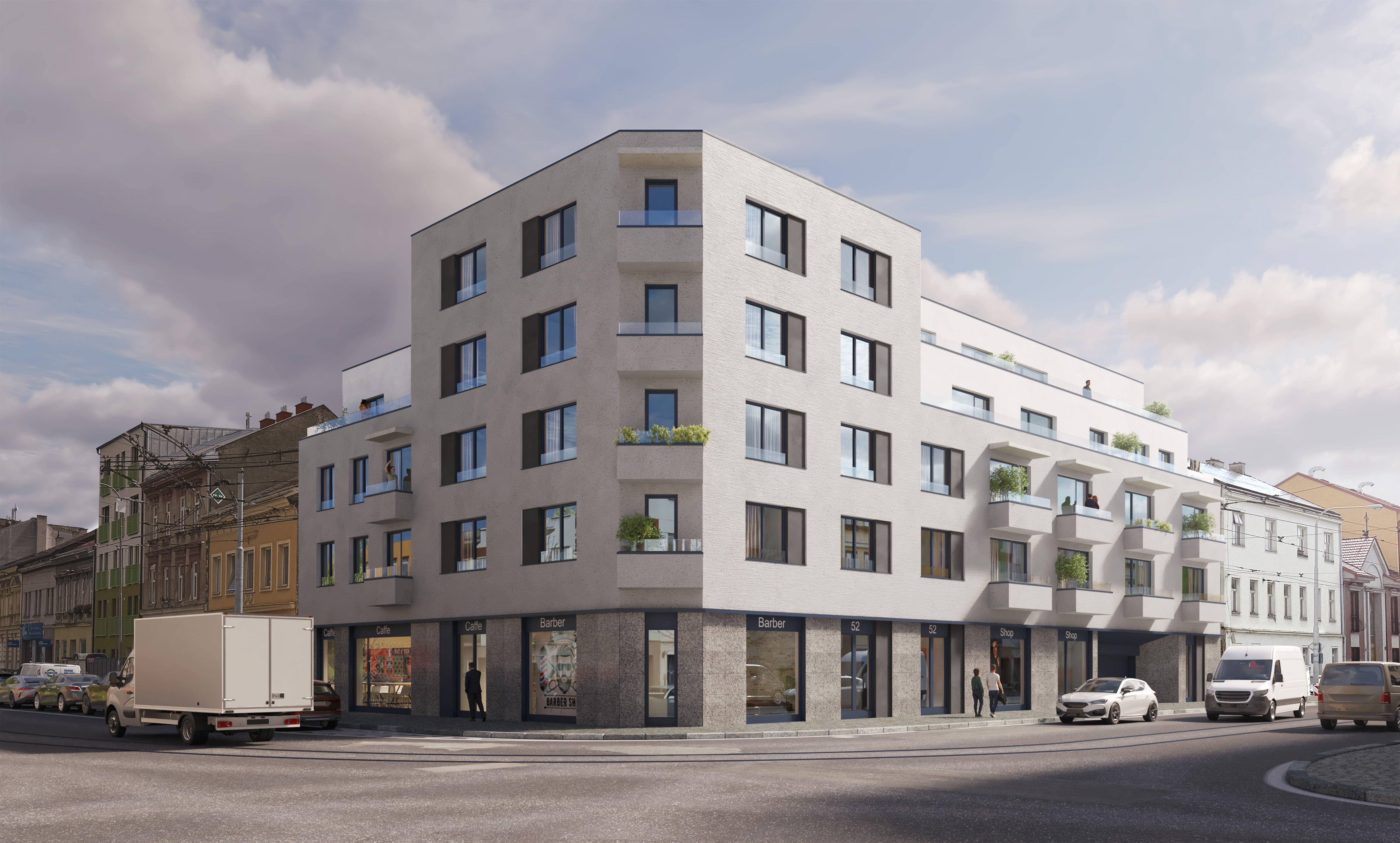 Zastávka tramvaje č. 4 je doslova pár kroků od domu a snadné napojení na městský okruh přes dokončené Tomkovo náměstí zaručuje vynikající dopravní dostupnost autem i MHD.